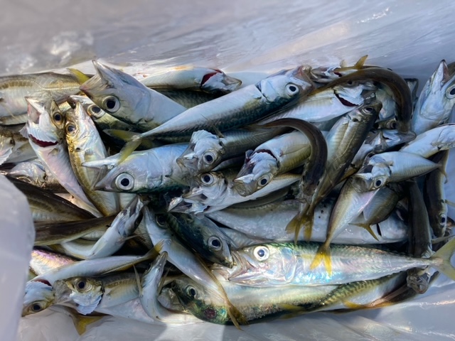 軍艦波止でも豆アジ、サバゴが袋にいっぱい入っていました。