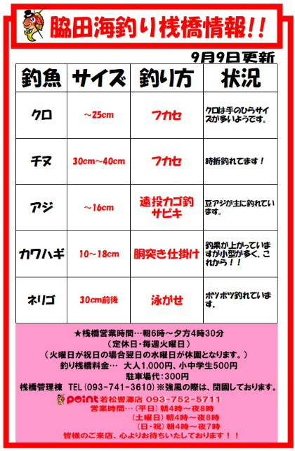 🆕9/8は、脇田海釣り桟橋の休憩所周りで15cm前後が好調♪